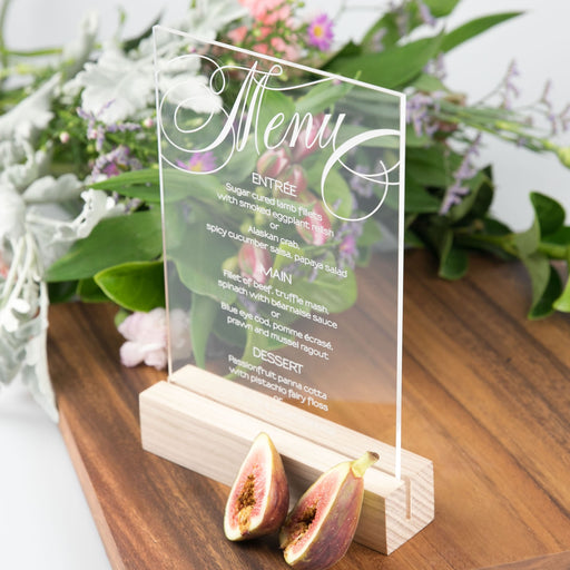View full detailsEngraved Clear Acrylic Menu with Wooden Base