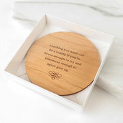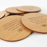 Cut to a circular shape and then professionally laser engraved with inspirational words and accompanying artwork, these attractive Alder wood coasters can be used for decorative or practical purposes.