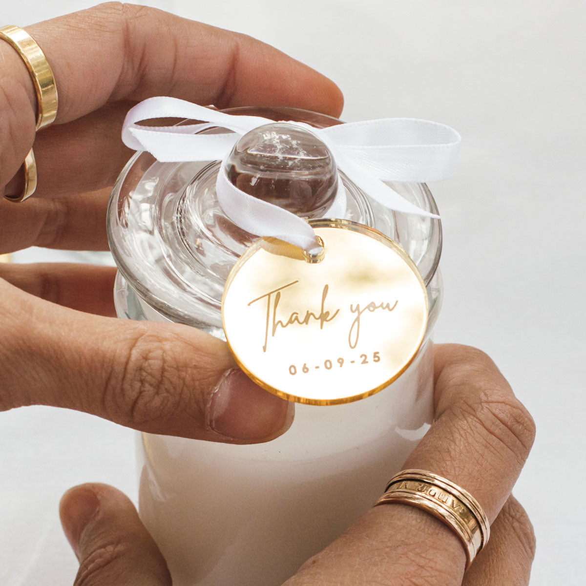 View full detailsFrench Tip Candles with Engraved Round Gold Acrylic Gift Tags Wedding Favour