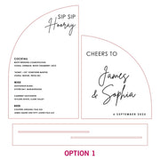 Our semi arch wedding bar menu features two gorgeous acrylic stand-up slates that complement each other beautifully. The mirror gold slate is the dominant eye-catcher of the pair and is ideal for inscribing your selected bevvies. The frosted acrylic balances the glow radiating from the mirror gold by introducing softer tones with a textured, milky sheen displaying clean cursive text.