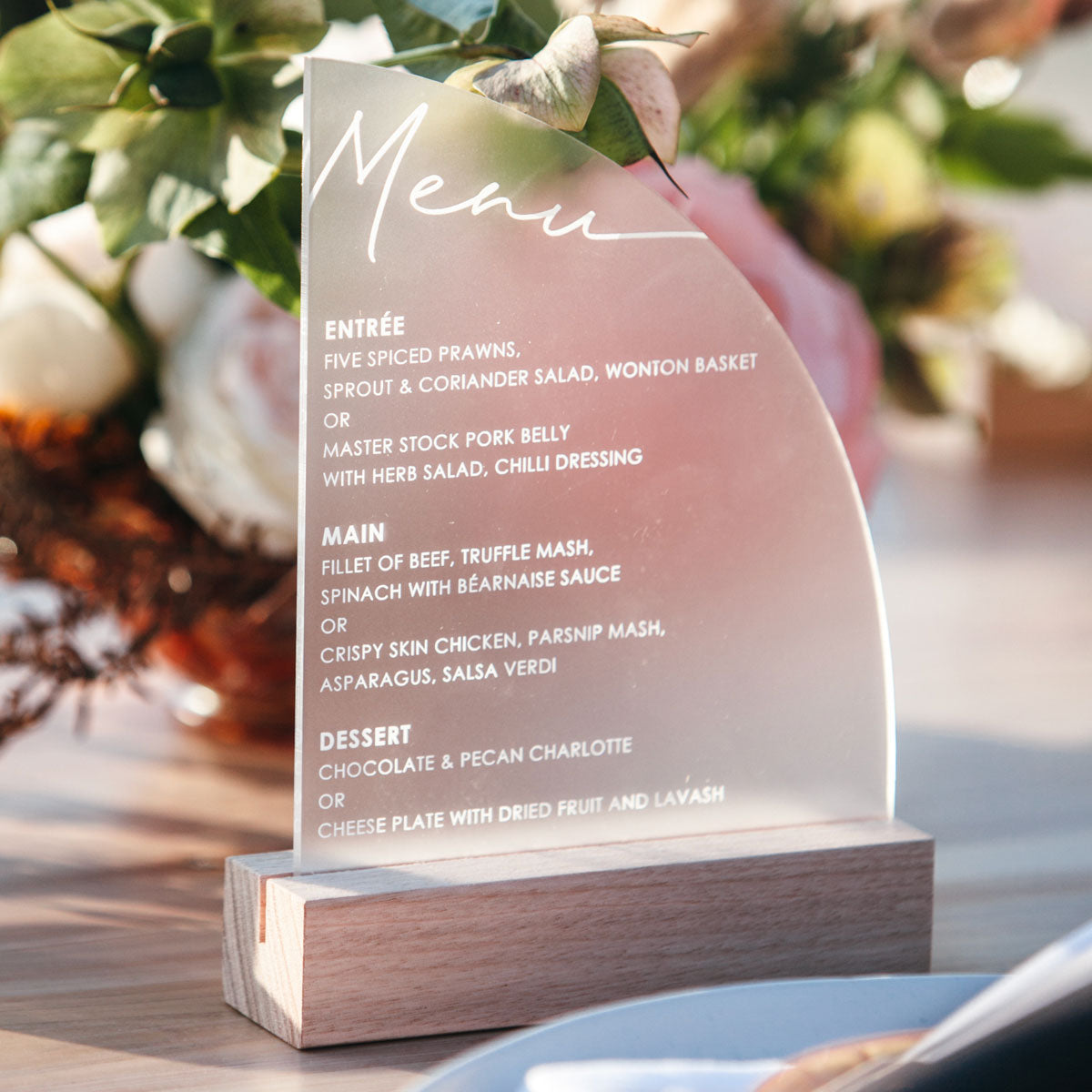 Whet your appetite with our chic frosted acrylic wedding menus. Our frosted acrylic menu cards have a luxurious, textured finish and allows adequat...