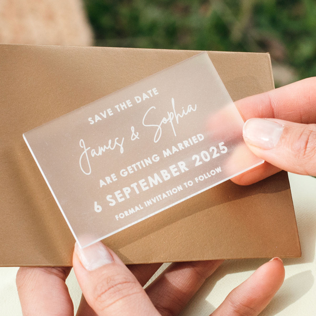 Locking in a date for your wedding deserves more than just a calendar reminder. Our frosted acrylic ‘save the date' cards are a classy way of givin...